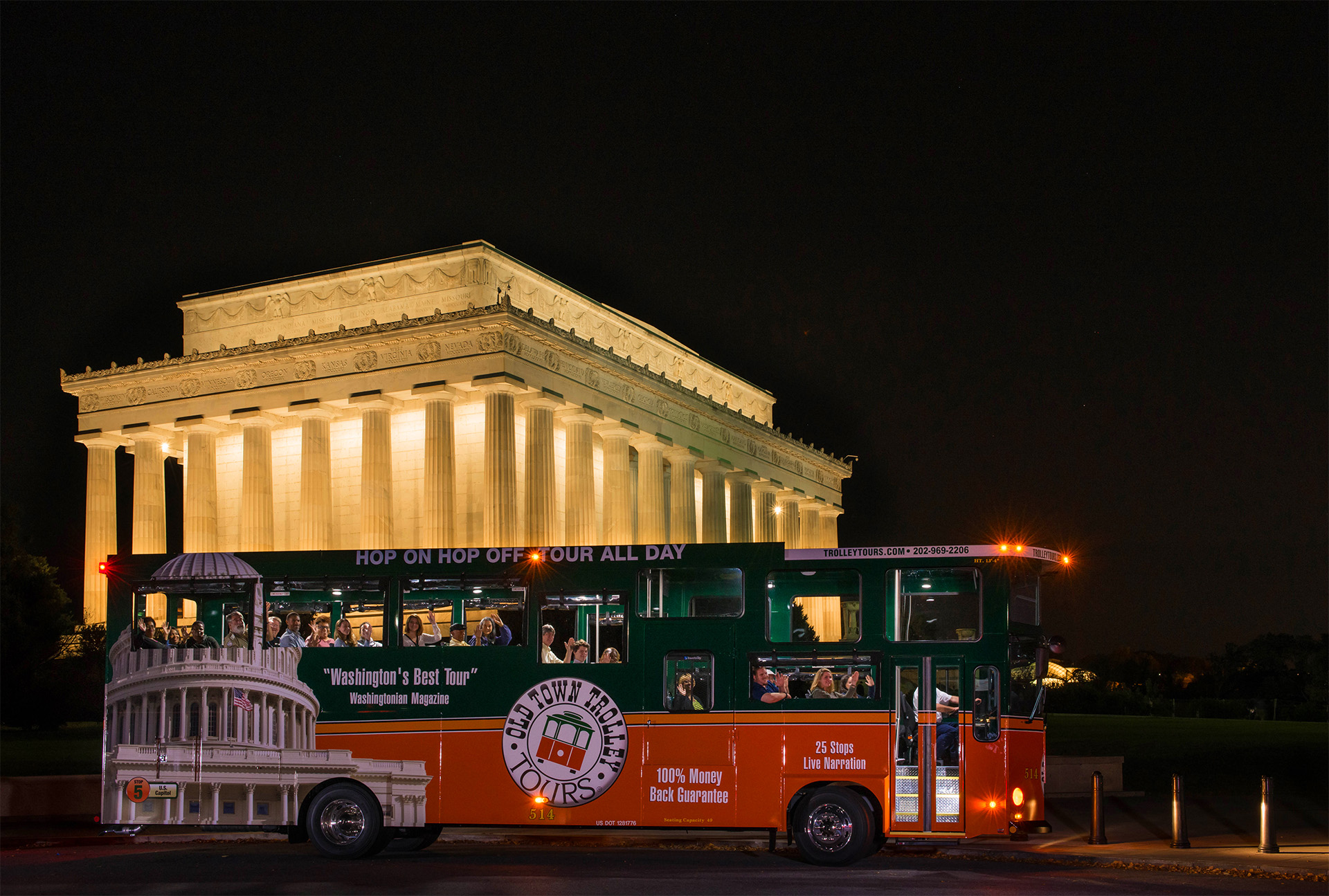 Start your evening with dinner at Union Station (there's a stop on the Red Line), where there are a number of sit-down and quick-service restaurants to sample. Plus, the glorious beaux-arts train station is the departure point for tours of the monuments at moonlight offered by Old Town Trolley. For trips on two wheels, Unlimited Biking and DC Cycling Concierge also offer evening tours in season departing from other points in the city. Even if you've made the rounds at all the monuments and memorials by day, there's something extra-special and magical about a nighttime tour.
